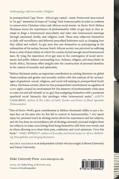 In postapartheid Cape Town-Africa's gay capital-many Pentecostal men turned to "ex-gay" ministries in hopes of "curing" their homosexuality in order to conform to conservative Christian values and African social norms. In Desire Work Melissa Hackman traces the experiences of predominantly white ex-gay men as they attempt to forge a heterosexual masculinity and enter into heterosexual marriage through emotional, bodily, and religious work. These men subjected themselves to daily self-surveillance and followed prescribed behaviors such as changing how they talked and walked. Ex-gay men also saw themselves as participating in the redemption of the nation, because South African society was perceived as suffering from a crisis of masculinity in which the country lacked enough moral heterosexual men. By tying the experience of ex-gay men to the convergence of social movements and public debates surrounding race, violence, religion, and masculinity in South Africa, Hackman offers insights into the construction of personal identities in the context of sexuality and spirituality.