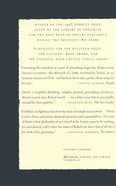 Nominated for the National Book Critics Circle Award for Poetry. I hate and--love. The sleepless body hammering a nail nails itself, hanging crucified.--from "Catullus: Excrucior" In Frank Bidart's collection of poems, the encounter with desire is the encounter with destiny. The first half contains some of Bidart's most luminous and intimate work-poems about the art of writing, Eros, and the desolations and mirror of history (in a spectacular narrative based on Tacitus). The second half of the book exts the overt lyricism of the opening section into even more ambitious territory-"The Second Hour of the Night" may be Bidart's most profound and complex meditation on the illusion of will, his most seductive dramatic poem to date. Desire is a 1997 National Book Award Finalist for Poetry.