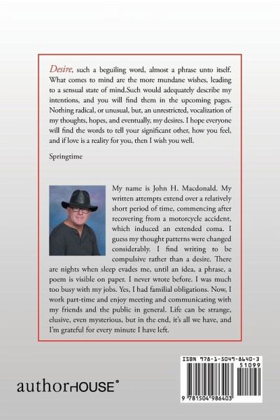 Desire,such a beguiling word, almost a phrase unto itself. What comes to mind are the more mundane wishes,leading to a sensual state of mind.Such would adequately describe my intentions,and you will find them in the upcoming pages.Nothing radical,or unusual,but, an unrestricted,vocalization of my thoughts,hopes, and eventually,my desires. I hope everyone will find the words to tell your significant other,how you feel, and if love is a reality for you,then I wish you well. Springtime
