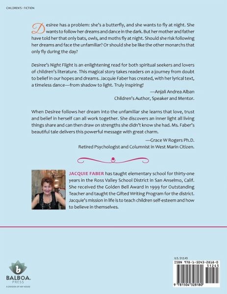 Desiree has a problem: she's a butterfly, and she wants to fly at night. She wants follow her dreams and dance in the dark. But her mother and father have told her that only bats, owls, and moths fly at night. Should she risk following her dreams and face the unfamiliar? Or should she be like the other monarchs that only fly during the day? Desiree's Night Flight is an enlightening read for both spiritual seekers and lovers of children's literature. This magical story takes readers on a journey from doubt to belief in our hopes and dreams. Jacquie Faber has created, with her lyrical text, a timeless dance-from shadow to light. Truly inspiring! -Anjali Andrea Alban Children's Author, Speaker and Mentor. When Desiree follows her dream into the unfamiliar she learns that love, trust and belief in herself can all work together. She discovers an inner light all living things share and can then draw on strengths she didn't know she had. Ms. Faber's beautiful tale delivers this powerful message with great charm. -Grace W Rogers Ph.D. Retired Psychologist and Columnist in West Marin Citizen.