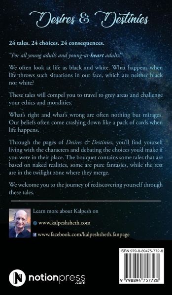 24 tales. 24 choices. 24 consequences. "For all young adults and young-at-heart adults!" We often look at life as black and white. What happens when life throws such situations in our face, which are neither black nor white? These tales will compel you to travel to grey areas and challenge your ethics and moralities. What's right and what's wrong are often nothing but mirages. Our beliefs often come crashing down like a pack of cards when life happens. Through the pages of Desires & Destinies, you'll find yourself living with the characters and debating the choices you'd make if you were in their place. The bouquet contains some tales that are based on naked realities, some are pure fantasies, while the rest are in the twilight zone where they merge. We welcome you to the journey of rediscovering yourself through these tales.