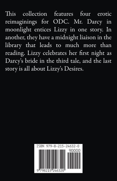 This collection features four erotic reimaginings for ODC. Mr. Darcy in moonlight entices Lizzy in one story. In another, they have a midnight liaison in the library that leads to much more than reading. Lizzy celebrates her first night as Darcy's bride in the third tale, and the last story is all about Lizzy's Desires.