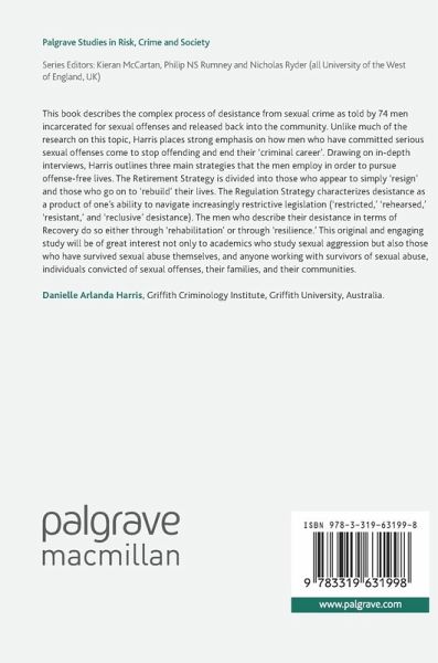 This book describes the complex process of desistance from sexual crime as told by 74 men incarcerated for sexual offenses and released back into the community. Unlike much of the research on this topic, Harris places strong emphasis on how men who have committed serious sexual offenses come to stop offending and end their 'criminal career'. Drawing on in-depth interviews, Harris outlines three main strategies that the men employ in order to pursue offense-free lives. The Retirement Strategy is divided into those who appear to simply 'resign' and those who go on to 'rebuild' their lives. The Regulation Strategy characterizes desistance as a product of one's ability to navigate increasingly restrictive legislation ('restricted,' 'rehearsed,' 'resistant,' and 'reclusive' desistance). The men who describe their desistance in terms of Recovery do so either through 'rehabilitation' or through 'resilience.' This original and engaging study will be of great interest not only to academics whostudy sexual aggression but also those who have survived sexual abuse themselves, and anyone working with survivors of sexual abuse, individuals convicted of sexual offenses, their families, and their communities.