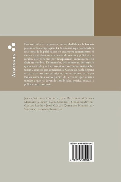 Esta colección de ensayos es una zambullida en la fantasía playera de lo archipelágico. La desistencia aquí practicada es una toma de la palabra que no escamotea agotamientos ni cierres y que abandona la escena de sujetos y políticas aurorales, disciplinantes por disciplinarias, moralizantes sin decir su nombre. Desmantelar, des-enmarcar, destituir lo que se entiende y se ha convenido como conversación sobre temas y asuntos que conciernen al Caribe de habla hispana es parte de este procedimiento, que transcurre en la polémica entendida como pálpito de tensiones que desatan sentido y que ha devenido sensibilidad poética, textual y política entre nosotros. Juan Cristóbal Castro · Juan Duchesne Winter · Magdalena López · Laura Maccioni · Gerardo Muñoz · Carlos Pabón · Juan Carlos Quintero Herencia · Sergio Villalobos-Ruminott