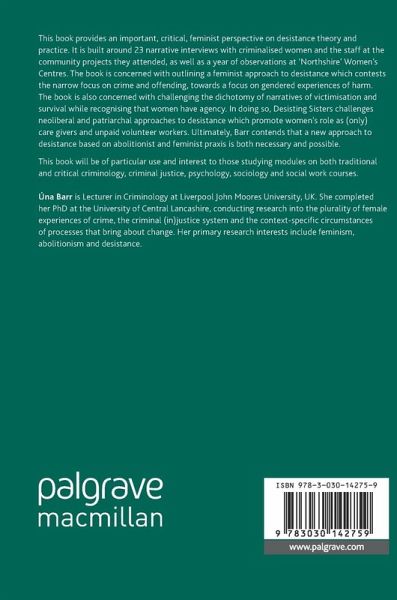 This book provides an important, critical, feminist perspective on desistance theory and practice. It is built around 23 original, narrative interviews with women and the staff of the community projects they attended, as well as a year of observations at Northshire Women's Centres. The book is concerned with outlining a feminist approach to desistance which recognises that the majority of women in the criminal justice system come from backgrounds of abuse, economic disadvantage and have alcohol, drug and mental health issues. The book is also be concerned with challenging the dichotomy of narratives of victimisation and survival while recognising that women have agency. In doing so, Desisting Sisters contests the neoliberal and patriarchal approach to desistance which promotes women's role as care givers and unpaid volunteer workers. Ultimately, Barr contends that women's desistance can resist neo-liberal, patriarchal constructs, much in the same way that feminist criminology has contended that women's offending more generally, often does. This book will be of particular use and interest to those studying modules on both traditional and critical criminology, criminal justice, psychology, sociology and social work courses.