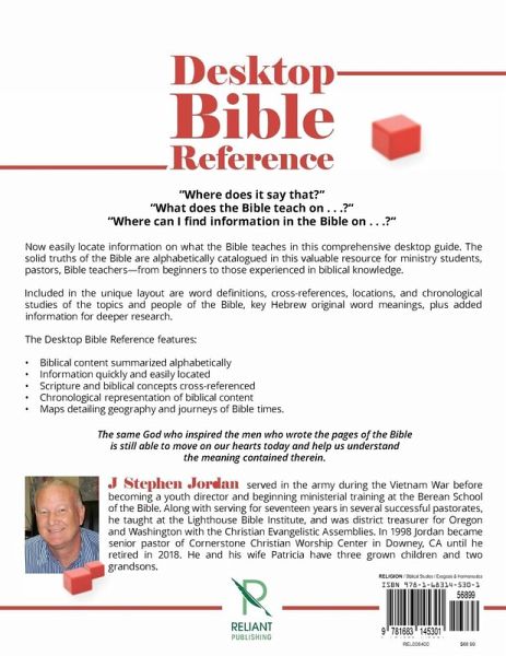 "Where does it say that?" "What does the Bible teach on . . .?" "Where can I find information in the Bible on . . .?" Now easily locate information on what the Bible teaches in this comprehensive desktop guide. The solid truths of the Bible are alphabetically catalogued in this valuable resource for ministry students, pastors, Bible teachers—from beginners to those experienced in biblical knowledge. Included in the unique layout are word definitions, cross-references, locations, and chronological studies of the topics and people of the Bible, key Hebrew original word meanings, plus added information for deeper research. The Desktop Bible Reference features: Biblical content summarized alphabetically Information quickly and easily located Scripture and biblical concepts cross-referenced Chronological representation of biblical content Maps detailing geography and journeys of Bible times. The same God who inspired the men who wrote the pages of the Bible is still able to move on our hearts today and help us understand the meaning contained therein.