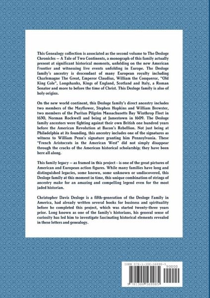 This Genealogy collection is associated as the second volume to The Desloge Chronicles - A Tale of Two Continents, a monograph of this family actually present at significant historical moments, unfolding on the new American Frontier and witnessing live events unfolding in Europe. This family legacy - as framed in this project - is one of the great pictures of American and European action figures. While many families have long and distinguished legacies, some known, some unknown or undiscovered, this Desloge family at this moment in time, this unique combination of strings of ancestry make for an amazing and compelling legend even for the most jaded historian. Christopher Davis Desloge is a fifth-generation of the Desloge Family in America. Long known as one of the family's historians, his general sense of curiosity has led him to investigate fascinating historical elements revealed in these letters and genealogy.