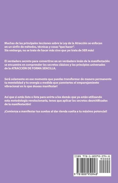 Descubre los factores que hacen falta para que finalmente manifiestes tus deseos. Sin sentirte agobiado con un sinfín de afirmaciones, tratando de hacer más, o siguiendo el último "truco" de manifestación.Tú, sí tú, tú eres el ¡TRUCO! No se trata de cuántos murales de deseos crees o cuantas afirmaciones recitas. Se trata de quién eres - tu energía, mentalidad, sentimientos, emociones y acciones. ¿¡Esta es exactamente la razón por la que el libro "Desmitificando los secretos de la manifestación" fue diseñado para ayudarte! En menos de dos horas aprenderás rápidamente cómo cambiar tu autoimagen y a comenzar a atraer tus deseos de manera más rápida sin "tratar de hacer más". Aquí está exactamente lo que vas a descubrir: ·El principio de manifestación más poderoso que la mayoría de las lecciones sobre la LDA PASAN POR ALTO. ·Las 3 palabras mágicas que pueden cambiar de forma inmediata tu realidad y la forma en que te tratas a ti mismo. ·La pregunta número 1 que absolutamente no puedes ignorar. ·¿Tratando de reprogramar tu mente subconsciente? ¡Descubre por qué puede que NO funcione a menos que te desprogrames tú mismo primero! ·Los enlaces perdidos entre el deseo y la decisión alineada (y el mejor acceso directo a la manifestación para que NUNCA te sientas atascado) ·La ciencia comprobada para manifestar más rápido al... ¡reducir la velocidad! · ¿Acaso tu entorno bloquea tus manifestaciones? (¡Dale un toque feng shui para mostrarle al Universo que estás listo para recibir!) · Cómo SANAR tu realidad jugando al detective de la manifestación. · ¡Además de ejercicios fáciles de seguir, basados en el amor y empoderados para manifestar lo que quieras de forma sencilla!Ahora ves que muchas de las principales lecciones sobre la LDA se enfocan en un sinfín de métodos, técnicas y cosas "que hacer", sin embargo, no se trata de hacer más sino que ¡se trata de SER más! El verdadero secreto para convertirse en un verdadero imán de la manifestación se encuentra en comprender los secretos clásicos y los principios universales de la ATRACCIÓN DE FORMA SENCILLA. Será solamente en ese momento que puedas transformar de manera permanente tu mentalidad y tu energía a medida que ¡conviertes el emparejamiento vibracional en lo que deseas manifestar!