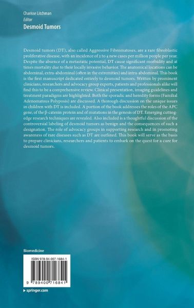 Desmoid Tumors (DT), also called Aggressive Fibromatoses, are a rare fibroblastic proliferative disease, with an incidence of 2 to 4 new cases per million people per year. Despite the absence of a metastatic potential, DT cause significant morbidity and at times mortality due to its locally invasive behaviour. The anatomical locations can be abdominal, extra-abdominal (often in the extremities) and intra-abdominal. This book is the first manuscript dedicated entirely to Desmoid Tumors. Written by prominent clinicians, researchers and advocacy group experts, patients and professionals alike will find this to be a comprehensive review. Clinical presentation, imaging guidelines and treatment paradigms are highlighted. Both the sporadic and heredity forms (Familial Adenomatous Polyposis) will be discussed. A thorough discussion on the unique issues in children with DT is included. A portion of the book will address the role of the APC gene, the beta-catenin protein and the role of mutations in the genesis of DT. Emerging cutting edge research techniques will be revealed. Also included is a thoughtful discussion on the controversial labelling of Desmoid Tumors as benign and the consequences of such a designation. The role of advocacy groups in supporting research and in promoting awareness of rare diseases such as DT will be outlined. This book will serve as basis to prepare clinicians, researchers and patients to embark on the quest for a cure for Desmoid Tumors.