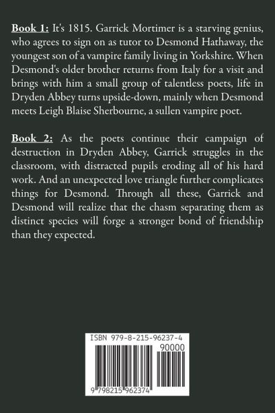 Book 1: It's 1815. Garrick Mortimer is a starving genius, who agrees to sign on as tutor to Desmond Hathaway, the youngest son of a vampire family living in Yorkshire. When Desmond's older brother returns from Italy for a visit and brings with him a small group of talentless poets, life in Dryden Abbey turns upside-down, mainly when Desmond meets Leigh Blaise Sherbourne, a sullen vampire poet. Book 2: As the poets continue their campaign of destruction in Dryden Abbey, Garrick struggles in the classroom, with distracted pupils eroding all of his hard work. And an unexpected love triangle further complicates things for Desmond. Through all these, Garrick and Desmond will realize that the chasm separating them as distinct species will forge a stronger bond of friendship than they expected.