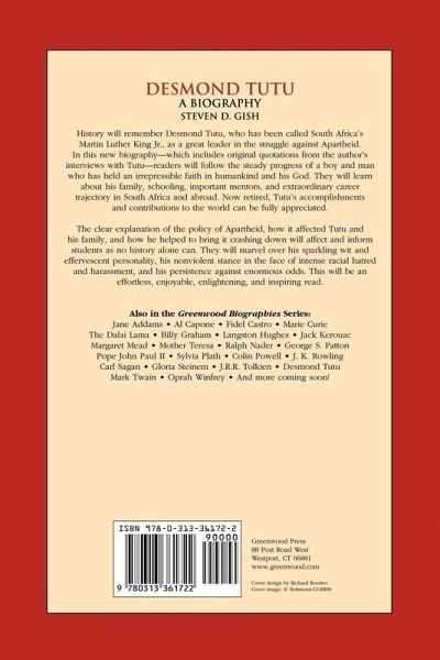 History will remember Desmond Tutu, who has been called South Africa's Martin Luther King, Jr., as a great leader in the struggle against apartheid. In this new biography, which includes original quotations from the author's interviews with Tutu, readers will follow the steady progress of a boy and man who has held an irrepressible faith in humankind and his God. They will learn about his family, schooling, important mentors, and extraordinary career trajectory in South Africa and abroad. Now retired, Tutu's accomplishments and contributions to the world can be fully appreciated. The clear explanation of the policy of apartheid, how it affected Tutu and his family, and how he helped to bring it crashing down will affect and inform students as no history alone can. They will marvel over his sparkling wit and effervescent personality, his nonviolent stance in the face of intense racial hatred and harassment, and his persistence against enormous odds. This will be an effortless, enjoyable, enlightening and inspiring read.