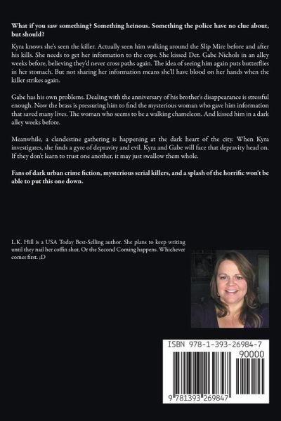 What if you saw something? Something heinous. Something the police have no clue about, but should? Kyra knows she's seen the killer. Actually seen him walking around the Slip Mire before and after his kills. She needs to get her information to the cops. She kissed Det. Gabe Nichols in an alley weeks before, believing they'd never cross paths again. The idea of seeing him again puts butterflies in her stomach. But not sharing her information means she'll have blood on her hands when the killer strikes again. Gabe has his own problems. Dealing with the anniversary of his brother's disappearance is stressful enough. Now the brass is pressuring him to find the mysterious woman who gave him information that saved many lives. The woman who seems to be a walking chameleon. And kissed him in a dark alley weeks before. Meanwhile, a clandestine gathering is happening at the dark heart of the city. When Kyra investigates, she finds a gyre of depravity and evil. Kyra and Gabe will face that depravity head on. If they don't learn to trust one another, it may just swallow them whole. Fans of dark urban crime fiction, mysterious serial killers, and a splash of the horrific won't be able to put this one down.