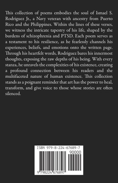 This collection of poems embodies the soul of Ismael S. Rodriguez Jr., a Navy veteran with ancestry from Puerto Rico and the Philippines. Within the lines of these verses, we witness the intricate tapestry of his life, shaped by the burdens of schizophrenia and PTSD. Each poem serves as a testament to his resilience, as he fearlessly channels his experiences, beliefs, and emotions onto the written page. Through his heartfelt words, Rodriguez bares his innermost thoughts, exposing the raw depths of his being. With every stanza, he unravels the complexities of his existence, creating a profound connection between his readers and the multifaceted nature of human existence. This collection stands as a poignant reminder that art has the power to heal, transform, and give voice to those whose stories are often silenced.