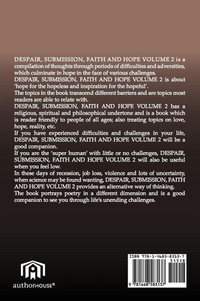 DESPAIR, SUBMISSION, FAITH AND HOPE VOLUME 2 is a compilation of thoughts through periods of difficulties and adversities, which culminate in hope in the face of various challenges. DESPAIR, SUBMISSION, FAITH AND HOPE VOLUME 2 is about 'hope for the hopeless and inspiration for the hopeful'. The topics in the book transcend different barriers and are topics most readers are able to relate with. DESPAIR, SUBMISSION, FAITH AND HOPE VOLUME 2 has a religious, spiritual and philosophical undertone and is a book which is reader friendly to people of all ages; also treating topics on love, hope, reality, etc. If you have experienced difficulties and challenges in your life, DESPAIR, SUBMISSION, FAITH AND HOPE VOLUME 2 will be a good companion. If you are the 'super human' with little or no challenges, DESPAIR, SUBMISSION, FAITH AND HOPE VOLUME 2 will also be useful when you feel low. In these days of recession, job loss, violence and lots of uncertainty, when science may be found wanting, DESPAIR, SUBMISSION, FAITH AND HOPE VOLUME 2 provides an alternative way of thinking. The book portrays poetry in a different dimension and is a good companion to see you through life's unending challenges.