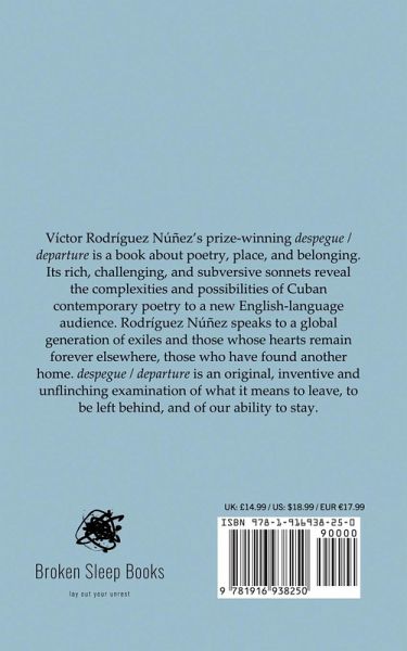 Víctor Rodríguez Núñez's prize-winning despegue / departure is a book about poetry, place, and belonging. Its rich, challenging, and subversive sonnets reveal the complexities and possibilities of Cuban contemporary poetry to a new English-language audience. Rodríguez Núñez speaks to a global generation of exiles and those whose hearts remain forever elsewhere, those who have found another home. despegue / departure is an original, inventive and unflinching examination of what it means to leave, to be left behind, and of our ability to stay.