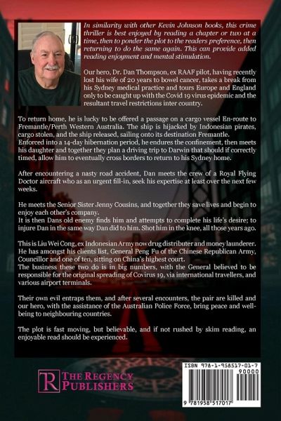 In similarity with other Kevin Johnson books, this crime thriller is best enjoyed by reading a chapter or two at a time, then to ponder the plot to the readers preference, then returning to do the same again. This can provide added reading enjoyment and mental stimulation. Our hero, Dr. Dan Thompson, ex RAAF pilot, having recently lost his wife of 20 years to bowel cancer, takes a break from his Sydney medical practice and tours Europe and England only to be caught up with the Covid 19 virus epidemic and the resultant travel restrictions inter country. To return home, he is lucky to be offered a passage on a cargo vessel En-route to Fremantle/Perth Western Australia. The ship is hijacked by Indonesian pirates, cargo stolen, and the ship released, sailing onto its destination Fremantle. Enforced into a 14-day hibernation period, he endures the confinement, then meets his daughter and together they plan a driving trip to Darwin that should if correctly timed, allow him to eventually cross borders to return to his Sydney home. After encountering a nasty road accident, Dan meets the crew of a Royal Flying Doctor aircraft who as an urgent fill-in, seek his expertise at least over the next few weeks. He meets the Senior Sister Jenny Cousins, and together they save lives and begin to enjoy each other's company. It is then Dans old enemy finds him and attempts to complete his life's desire; to injure Dan in the same way Dan did to him. Shot him in the knee, all those years ago. This is Liu Wei Cong, ex Indonesian Army now drug distributer and money launderer. He has amongst his clients list, General Peng Fu of the Chinese Republican Army, Councillor and one of ten, sitting on China's highest court. The business these two do is in big numbers, with the General believed to be responsible for the original spreading of Covirus 19, via international travellers, and various airport terminals. The plot is fast moving, but believable, and if not rushed by skim reading, an enjoyable read should be experienced.