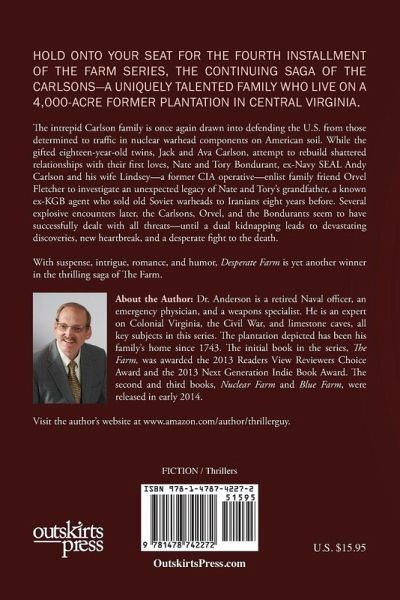 About the Author: Dr. Anderson is a retired Naval officer, an emergency physician, and a weapons specialist. He is an expert on Colonial Virginia, the Civil War, and limestone caves, all key subjects in this series. The plantation depicted has been his family's home since 1743. The initial book in the series, The Farm, was awarded the 2013 Readers View Reviewers Choice Award and the 2013 Next Generation Indie Book Award. The second and third books, Nuclear Farm and Blue Farm, were released in early 2014. Visit the author's website at www.amazon.com/author/thrillerguy.