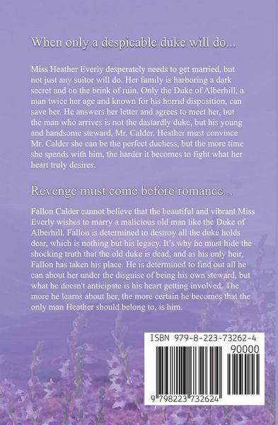 When only a despicable duke will do... Miss Heather Everly desperately needs to get married, but not just any suitor will do. Her family is harboring a dark secret and on the brink of ruin. Only the Duke of Alberhill, a man twice her age and known for his horrid disposition, can save her. He answers her letter and agrees to meet her, but the man who arrives is not the dastardly duke, but his young and handsome steward, Mr. Calder. Heather must convince Mr. Calder she can be the perfect duchess, but the more time she spends with him, the harder it becomes to fight what her heart truly desires. Revenge must come before romance... Fallon Calder cannot believe that the beautiful and vibrant Miss Everly wishes to marry a malicious old man like the Duke of Alberhill. Fallon is determined to destroy all the duke holds dear, which is nothing but his legacy. It's why he must hide the shocking truth that the old duke is dead, and as his only heir, Fallon has taken his place. He is determined to find out all he can about her under the disguise of being his own steward, but what he doesn't anticipate is his heart getting involved. The more he learns about her, the more certain he becomes that the only man Heather should belong to, is him.