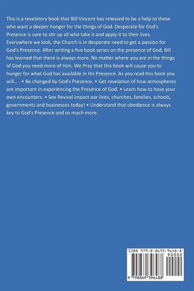 This is a revelatory book that Bill Vincent has released to be a help to those who want a deeper hunger for the things of God. Desperate for God's Presence is sure to stir up all who take it and apply it to their lives. Everywhere we look, the Church is in desperate need to get a passion for God's Presence. After writing a five book series on the presence of God, Bill has learned that there is always more. No matter where you are in the things of God you need more of Him. We Pray that this book will cause you to hunger for what God has available in His Presence. As you read this book you will... . ¿ Be changed by God's Presence. ¿ Get revelation of how atmospheres are important in experiencing the Presence of God. ¿ Learn how to have your own encounters. ¿ See Revival impact our lives, churches, families, schools, governments and businesses today! ¿ Understand that obedience is always key to God's Presence and so much more.
