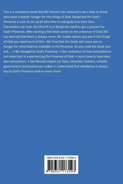 This is a revelatory book that Bill Vincent has released to be a help to those who want a deeper hunger for the things of God. Desperate for God's Presence is sure to stir up all who take it and apply it to their lives. Everywhere we look, the Church is in desperate need to get a passion for God's Presence. After writing a five book series on the presence of God, Bill has learned that there is always more. No matter where you are in the things of God you need more of Him. We Pray that this book will cause you to hunger for what God has available in His Presence. As you read this book you will... . ¿ Be changed by God's Presence. ¿ Get revelation of how atmospheres are important in experiencing the Presence of God. ¿ Learn how to have your own encounters. ¿ See Revival impact our lives, churches, families, schools, governments and businesses today! ¿ Understand that obedience is always key to God's Presence and so much more.