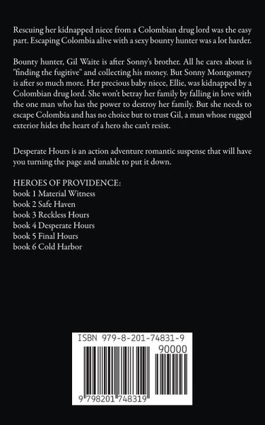 Rescuing her kidnapped niece from a Colombian drug lord was the easy part. Escaping Colombia alive with a sexy bounty hunter was a lot harder. Bounty hunter, Gil Waite is after Sonny's brother. All he cares about is "finding the fugitive" and collecting his money. But Sonny Montgomery is after so much more. Her precious baby niece, Ellie, was kidnapped by a Colombian drug lord. She won't betray her family by falling in love with the one man who has the power to destroy her family. But she needs to escape Colombia and has no choice but to trust Gil, a man whose rugged exterior hides the heart of a hero she can't resist. Desperate Hours is an action adventure romantic suspense that will have you turning the page and unable to put it down. HEROES OF PROVIDENCE: book 1 Material Witness book 2 Safe Haven book 3 Reckless Hours book 4 Desperate Hours book 5 Final Hours book 6 Cold Harbor