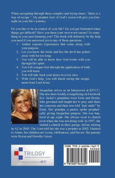 When navigating through these complex and trying times, "there is a way of escape." My prophet view of God's vision will give you foresight on your life's journey. Do you like to be in control of your life? Do you get frustrated when things get difficult? Have you been your own worst enemy? Is something in your past haunting you? This book will definitely be the help you need if you answered yes to any of those questions.Author exposes experiences that come along with your purpose. Let you know the tricks and lies the devil has gotten away with for too long. You will be able to know how God works with you through His spirit. You will conquer fear through the application of truth you will learn. You will take back your peace in every area. With God's help, you will finish strong the assignment from Lord Jesus.