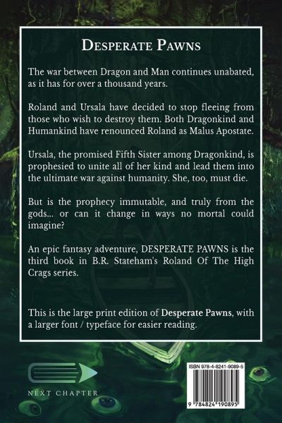 The war between Dragon and Man continues unabated, as it has for over a thousand years. Roland and Ursala have decided to stop fleeing from those who wish to destroy them. Both Dragonkind and Humankind have renounced Roland as Malus Apostate. Ursala, the promised Fifth Sister among Dragonkind, is prophesied to unite all of her kind and lead them into the ultimate war against humanity. She, too, must die. But is the prophecy immutable, and truly from the gods... or can it change in ways no mortal could imagine? An epic fantasy adventure, DESPERATE PAWNS is the third book in B.R. Stateham's Roland Of The High Crags series. This is the large print edition of Desperate Pawns, with a larger font / typeface for easier reading.