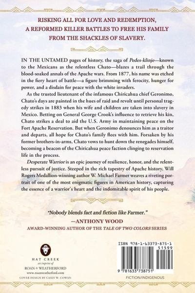 Risking all for love and redemption, a reformed killer battles to free his family from the shackles of slavery. ¿¿In the untamed pages of history, the saga of Pedes-klinje-known to the Mexicans as the relentless Chato-blazes a trail through the blood-soaked annals of the Apache wars. From 1877, his name was etched in the fiery heart of battle-a figure brimming with ferocity, hunger for power, and a disdain for peace with the white invaders. As the trusted lieutenant of the infamous Chircauhua chief Geronimo, Chato's days are painted in the hues of raid and revolt until personal tragedy strikes in 1883 when his wife and children are taken into slavery in Mexico. Betting on General George Crook's influence to retrieve his kin, Chato strikes a deal to aid the U.S. Army in maintaining peace on the Fort Apache Reservation. But when Geronimo denounces him as a traitor and departs, all hope for Chato's family flees with him. Forsaken by his former brothers-in-arms, Chato vows to hunt down the renegades himself, becoming a beacon of the Chiricahua peace faction clinging to reservation life in the process. Desperate Warrior is an epic journey of resilience, honor, and the relentless pursuit of justice. Steeped in the rich tapestry of Apache history, Will Rogers Medallion-winning author W. Michael Farmer weaves a riveting portrait of one of the most enigmatic figures in American history, capturing the essence of a warrior's heart and the indomitable spirit of his people.