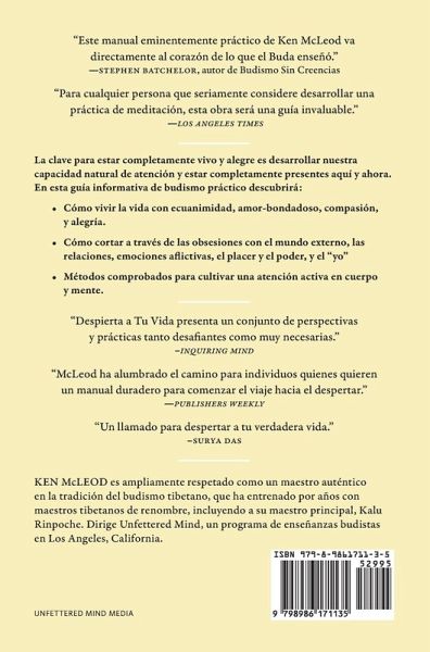En esta maravillosa guía el respetado maestro Ken McLeod deconstruye el budismo tibetano para convertirlo en un sendero accesible al lector occidental. Con abundante material anecdótico e ilustrativo, aborda un vasto número de enseñanzas, desde las Cuatro Nobles Verdades, pasando por las meditaciones de muerte y la impermanencia, el karma, el entrenamiento mental, y las prácticas de visión profunda. Especialmente atractivas y relevantes para lectores occidentales son las secciones sobre el desmantelamiento del apego al éxito convencional y el trabajo con emociones reactivas (ira, codicia, deseo, celos y orgullo). La clave para estar plenamente vivos y alegres en nuestra vida, nos plantea McLeod. es desarrollar nuestra capacidad natural de atención y estar plenamente presentes aquí y ahora. En esta guía -que es una verdadera enciclopedia- sobre el budismo práctico descubrirá: Cómo vivir la vida con ecuanimidad, bondad amorosa, compasión y alegría. Cómo superar las obsesiones con el mundo externo, las relaciones, las emociones dañinas, el placer y el poder, y con el propio ego. Métodos probados y efectivos para cultivar la atención activa con el cuerpo y la mente.