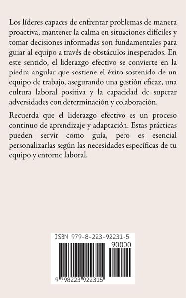 Los líderes capaces de enfrentar problemas de manera proactiva, mantener la calma en situaciones difíciles y tomar decisiones informadas son fundamentales para guiar al equipo a través de obstáculos inesperados. En este sentido, el liderazgo efectivo se convierte en la piedra angular que sostiene el éxito sostenido de un equipo de trabajo, asegurando una gestión eficaz, una cultura laboral positiva y la capacidad de superar adversidades con determinación y colaboración. Recuerda que el liderazgo efectivo es un proceso continuo de aprendizaje y adaptación. Estas prácticas pueden servir como guía, pero es esencial personalizarlas según las necesidades específicas de tu equipo y entorno laboral.