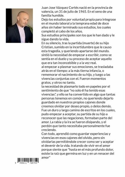 Juan Jose Vázquez Cortés nació en la provincia de valencia, un 31 de julio de 1965. En el seno de una familia humilde. Dejo los estudios por voluntad propia para integrase en el mundo laboral a la temprana edad de doce años sin haber terminado sus estudios, los cuales completó al cabo de los años. Sus estudios principales son los que le han dado y le sigue dando la vida. En su silencio, tras la partida (muerte) de su hijo Cristian, sumido en la incertidumbre que le causo esta tragedia, y queriendo apartarse del mundo. sintió la necesidad de empezar a escribir, como se sentía en el duelo y su proceso de aceptar aquello que era tan inconcebible y a la vez real. al empezar a plasmar sus emociones, se trasladaba atrás en el tiempo: a la más tierna infancia, o rememorar el nacimiento de su hijo, y luego a las vivencias conjuntas con el. Fueron momentos gratos, y otros no tanto. la necesidad de plasmarlo todo en papeles por el sentimiento de que "no solo él ha tenido esas vivencias", y ello se ha convertido en algo que tantas personas tenemos en común, no queriendo dejarlo guardado en nuestros propios cajones donde creemos olvidar por deseo propio, o delos demás. Fue un duro y largo camino de escritos en los cuales, pudo empezar a aceptar, su partida de su hijo a reconocer que las negaciones, formaban parte del amor. La rabia y la ira se fueron disipando, y el perdón que tanto necesitaba personalmente fue creciendo. Con todo, aprendió como guardar experiencias y vivencias en esos cajones del olvido, pero sin olvidarlas permitiéndole crecer como ser y aceptar el devenir de la vida. tratando de vivir en el amor porque siente que "hasta en el más profundo dolor, existe la raíz que germina en luz y en un renacer del amor"