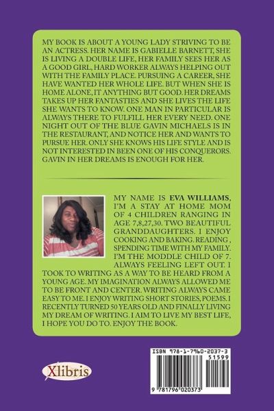 My book is about a young lady striving to be an actress. Her name is Gabielle Barnett. She is living a double life. Her family sees her as a good girl and a hard worker, always helping out with the family place pursuing a career she have wanted her whole life. But when she is home alone, it's anything but good. Her dreams takes up her fantasies, and she lives the life she wants to know. One man in particular is always there to fulfill her every need. One night, out of the blue, Gavin Michaels is in the restaurant and notices her and wants to pursue her. Only she knows his lifestyle and is not interested in being one of his conquerors. Gavin in her dreams is enough for her.