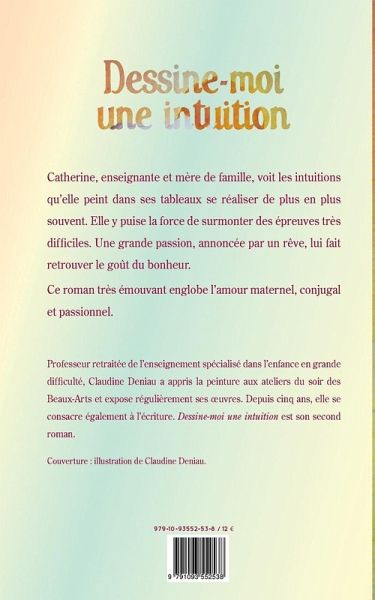 Catherine, enseignante et mère de famille, doit faire face à un deuil insurmontable. Son fils cadet disparu, elle ne tient plus que portée par la responsabilité d'éduquer son aîné. La vie n'a plus de saveur, elle n'attend plus rien. Quelques années plus tard, alors qu'elle prend conscience de son pouvoir intuitif, elle renoue avec la peinture et se retrouve à vivre une passion improbable avec un très jeune homme, relation grâce à laquelle elle retrouvera le chemin de la vie et le goût du bonheur. Professeur retraitée de l'enseignement spécialisé dans l'enfance en grande difficulté, Claudine Deniau a appris la peinture aux ateliers du soir des Beaux-Arts et expose régulièrement ses oeuvres. Depuis cinq ans, elle se consacre également à l'écriture. "Dessine-moi une intuition" est son second roman.