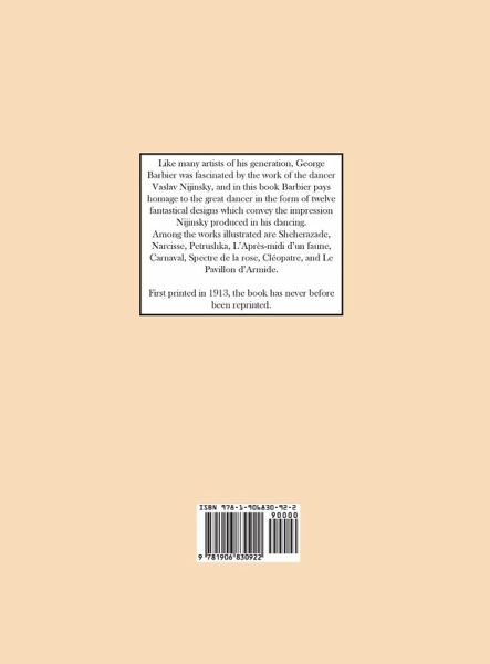 Like many artists of his generation, George Barbier was fascinated by the work of the dancer Vaslav Nijinsky, and in this book Barbier pays homage to the great dancer in the form of twelve fantastical colour designs which convey the impression Nijinsky produced in his dancing. Among the works illustrated are Sheherazade, Narcisse, Petrushka, L’Après-midi d’un faune, Carnaval, Spectre de la rose, Cléopatre, and Le Pavillon d’Armide. The plates are preceded by a short text in French by Francis de Miomandre. First printed in 1913, the book has never before been reprinted.
