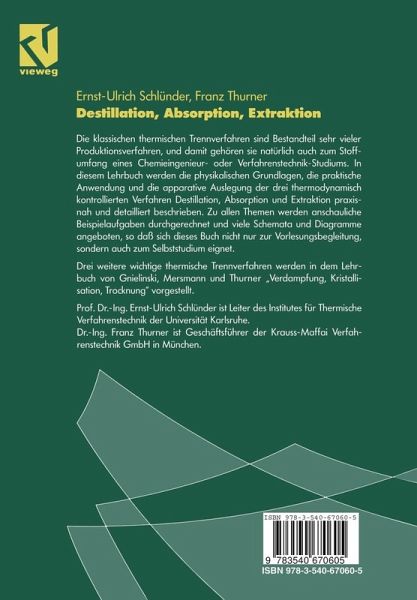 Die klassischen thermischen Trennverfahren sind Bestandteil sehr vieler Produktionsverfahren, und damit gehören sie natürlich auch zum Stoffumfang eines Chemieingenieur- oder Verfahresntechnik-Studiums. In diesem Lehrbuch werden die physikalischen Grundlagen, die praktische Anwendung und die apparative Auslegung der drei thermodynamisch kontrollierten Verfahren Destillation, Absorption und Extraktion praxisnah und detailliert beschrieben. Zu allen Themen werden anschauliche Beispielaufgaben durchgerechnet und viele Schemata und Diagramme angeboten, so daß sich dieses Buch nicht nur zur Vorlesungsbegleitung, sondern auch zum Selbststudium eignet. Drei weitere wichtige thermische Trennverfahren werden in dem Lehrbuch von Gnielinski, Mersmann und Thurner "Verdampfung, Kristallisation, Trocknung" vorgestellt.