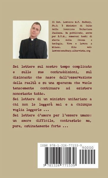 Sei lettere sul nostro tempo complicato e sulle sue contraddizioni, sul disincanto che nasce dall'osservazione della realtà e su una speranza che vuole tenacemente continuare ad esistere nonostante tutto. Sei lettere di un ministro unitariano a chi non le leggerà mai e a chiunque voglia leggerle ... Sei lettere d'amore per l'essere umano: un amore difficile, contrastato ma, pure, ostinatamente forte ...
