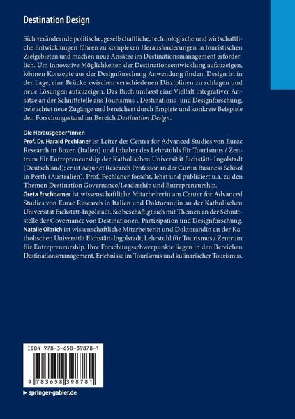 ¿Prof. Dr. Harald Pechlaner ist Leiter des Center for Advanced Studies von Eurac Research in Bozen (Italien) und Inhaber des Lehrstuhls für Tourismus / Zentrum für Entrepreneurship der Katholischen Universität Eichstätt-Ingolstadt (Deutschland); er ist Adjunct Research Professor an der Curtin Business School in Perth (Australien). Prof. Pechlaner forscht, lehrt und publiziert u.a. zu den Themen Destination Governance/Leadership und Entrepreneurship. Greta Erschbamer ist wissenschaftliche Mitarbeiterin am Center for Advanced Studies von Eurac Research in Italien und Doktorandin an der Katholischen Universität Eichstätt-Ingolstadt. Sie beschäftigt sich mit Themen an der Schnittstelle der Governance von Destinationen, Partizipation und Designforschung. Natalie Olbrich ist wissenschaftliche Mitarbeiterin und Doktorandin an der Katholischen Universität Eichstätt-Ingolstadt, Lehrstuhl für Tourismus / Zentrum für Entrepreneurship. Ihre Forschungsschwerpunkte liegen in den Bereichen Destinationsmanagement, Erlebnisse im Tourismus und kulinarischer Tourismus.