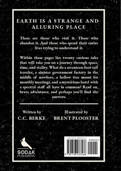 Earth is a strange and alluring place. There are those who visit it. Those who abandon it. And those who spend their entire lives trying to understand it. Within these pages lies twenty curious tales that will take you on a journey through space, time, and reality. What do a seventeen-foot-tall traveler, a sinister government factory in the middle of nowhere, a hollow tree meant for monthly meetings, and a mysterious hotel with a spectral staff all have in common? Read on, brave adventurer, and perhaps you'll find the answers.