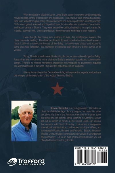 With the death of Vladimir Lenin, Josef Stalin came into power and immediately moved to state control of production and distribution. The Kozlovs were branded as kulaks, their farm seized through a policy of collectivization and their crops treated as state property. Stalin interrogated, arrested, and deported dissenters in cattle cars to isolated concentration and labour camps in Siberia. They were treated like cattle, shuttled from camp to camp, fed if useful, starved if not. Unless productive, their lives were worthless to their masters. Even though the Gulag took millions of lives, the indifference towards this phenomenon is startling. The absence of hard information backed up by archival research made it difficult to unlock the horrors of the Gulag. Archives were closed and access to camp sites was forbidden. No television or cameras ever filmed the Soviet camps or its victims. Today, Russians seldom want to debate, discuss, or even acknowledge the Gulag. Russia has few monuments to the victims of Stalin's execution squads and concentration camps. There is no national monument or place of mourning and no government inquiries into what happened in the past. It is as if the deportees left no footprints. It is my fervent hope that Destination Gulag will capture the tragedy, and perhaps the triumph, of the deportation of the Kozlov family to Siberia.