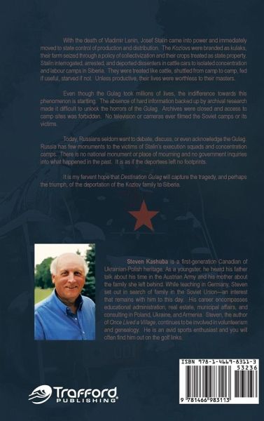 With the death of Vladimir Lenin, Josef Stalin came into power and immediately moved to state control of production and distribution. The Kozlovs were branded as kulaks, their farm seized through a policy of collectivization and their crops treated as state property. Stalin interrogated, arrested, and deported dissenters in cattle cars to isolated concentration and labour camps in Siberia. They were treated like cattle, shuttled from camp to camp, fed if useful, starved if not. Unless productive, their lives were worthless to their masters. Even though the Gulag took millions of lives, the indifference towards this phenomenon is startling. The absence of hard information backed up by archival research made it difficult to unlock the horrors of the Gulag. Archives were closed and access to camp sites was forbidden. No television or cameras ever filmed the Soviet camps or its victims. Today, Russians seldom want to debate, discuss, or even acknowledge the Gulag. Russia has few monuments to the victims of Stalin's execution squads and concentration camps. There is no national monument or place of mourning and no government inquiries into what happened in the past. It is as if the deportees left no footprints. It is my fervent hope that Destination Gulag will capture the tragedy, and perhaps the triumph, of the deportation of the Kozlov family to Siberia.