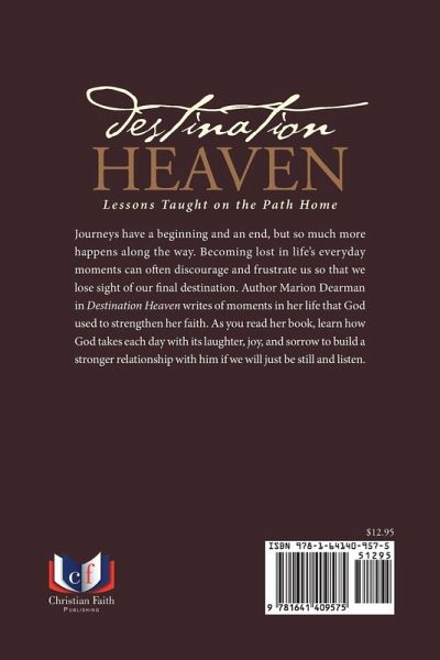 Journeys have a beginning and an end, but so much more happens along the way. Becoming lost in life's everyday moments can often discourage and frustrate us so that we lose sight of our final destination. Author Marion Dearman in Destination Heaven writes of moments in her life that God used to strengthen her faith. As you read her book, learn how God takes each day with its laughter, joy, and sorrow to build a stronger relationship with him if we will just be still and listen.