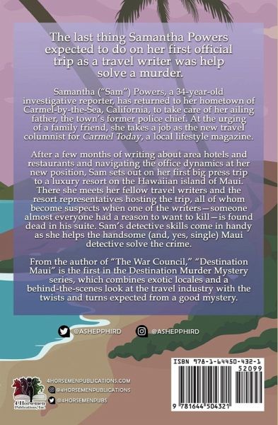 The last thing Samantha Powers expected to do on her first official trip as a travel writer was help solve a murder. Samantha ("Sam") Powers, a 34-year-old investigative reporter, has returned to her hometown of Carmel-by-the-Sea, California, to take care of her ailing father, the town's former police chief. At the urging of a family friend, she takes a job as the new travel columnist for Carmel Today, a local lifestyle magazine. After a few months of writing about area hotels and restaurants and navigating the office dynamics at her new position, Sam sets out on her first big press trip to a luxury resort on the Hawaiian island of Maui. There she meets her fellow travel writers and the resort representatives hosting the trip, all of whom become suspects when one of the writers-someone almost everyone had a reason to want to kill-is found dead in his suite. Sam's detective skills come in handy as she helps the handsome (and, yes, single) Maui detective solve the crime. "Destination: Maui" is the first in the Destination Murder Mystery series, which combines exotic locales and a behind-the-scenes look at the travel industry with the twists and turns expected from a good mystery.