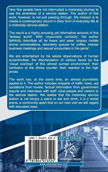 Very few people have not interrupted a motorway journey to use the amenities of a service station. The author of this work, however, is not just passing through. His mission is to create a contemporary record in diary form of everyday life at a motorway service station. The result is a highly amusing yet informative account of this 'fantasy world'. With 'voyeuristic curiosity', the author faithfully describes all he hears and sees: snappy mobile phone conversations, disorderly queues for coffee, intense business meetings and sexual encounters in the gents'. We are entertained by his astute observations of human eccentricities: the disorientation of visitors faced by the 'visual overload' of this almost surreal environment; their confusion at the drinks counter; their reaction to the high prices. The work has, at the same time, an almost journalistic appeal to it. The author includes snippets of traffic news, apt quotations from novels, factual information from government reports and interviews with staff, local people and visitors to the service station. We realise that the motorway service station is not simply a place to eat and drink; it is a social arena, a community apart that on our next visit we will regard with educated eyes.