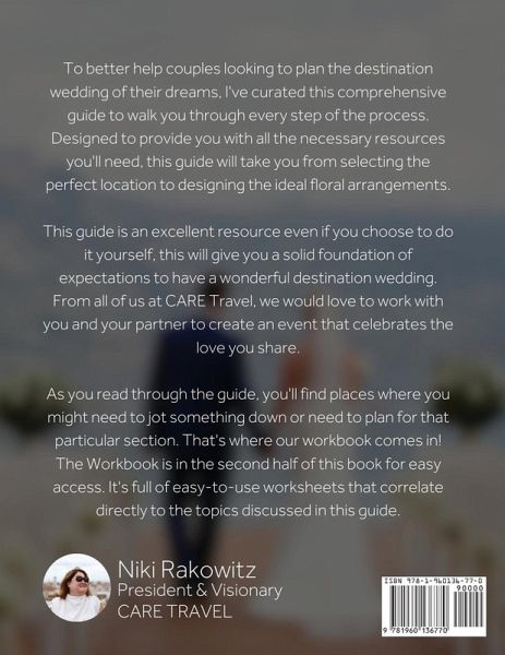 To better help couples looking to plan the destination wedding of their dreams, I've curated this comprehensive guide to walk you through every step of the process. Designed to provide you with all the necessary resources you'll need, this guide will take you from selecting the perfect location to designing the ideal floral arrangements. This guide is an excellent resource even if you choose to do it yourself, this will give you a solid foundation of expectations to have a wonderful destination wedding. From all of us at CARE Travel, we would love to work with you and your partner to create an event that celebrates the love you share. As you read through the guide, you'll find places where you might need to jot something down or need to plan for that particular section. That's where our workbook comes in! The Workbook is in the second half of this book for easy access. It's full of easy-to-use worksheets that correlate directly to the topics discussed in this guide.