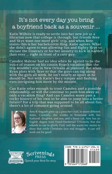 It's not every day you bring a boyfriend back as a souvenir. Katie Wilhite is ready to settle into her new job as a librarian now that college is through, but friends Bree and Skye want one more girls' trip, and when Bree insists this is her bachelorette fling, Katie agrees. What she didn't agree to was allowing fun and flighty Skye to dictate the itinerary or for her anxiety to kick in harder than ever ... right in front of a cute guy. Camden Malone had no idea when he agreed to be the voice of reason on his cousin Ryan's vacation that the trip wouldn't stay in New Orleans as planned. But when Ryan plots with Skye so that the guys can tag along with the girls all week, he isn't nearly as upset as he should be. Not with Katie's fiery temper and flashing eyes intriguing him more by the minute. Can Katie relax enough to trust Camden and a possible future, or will she continue to push him away as only a vacation fling? And can Camden move past a rocky history of his own to be able to jump into a better future? For a trip that was supposed to be all about fun, there's a lot of romance going around.