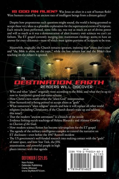 Is God an alien? Was Jesus an alien in a suit of human -flesh? Were humans actually created by an ancient race of intelligent beings from a distant galaxy? Despite how preposterous such questions might sound today, the world is being groomed to accept these very ideas as a plausible explanation for the supernatural events of Scripture. Each miracle Jesus performed in the New Testament, some folks say, was not as much an act of divine power and will as much as it was a demonstration of alien mastery over sciences, we can't yet fathom. The ET gospel currently merging into mainstream Theology seems to have an answer for every dilemma-most of which must ignore portions of Scripture to be true. Meanwhile, tragically, the Church remains ignorant, insisting that "aliens don't exist" and "the Bible is silent on the topic," while the lost remain lost and the Bible's clear teaching on the subject is ignored. In Destination Earth, readers discover:Who and what "aliens" originally were according to the Bible, and what they're up to now in Antichrist's grand end-times scheme.How Christ's own words refute the "alien-God" interpretation. How humankind is being primed to accept aliens as "gods". What tomorrow's "alien religion" entails, and how it will replace all other world religions (including Christianity, if the Church doesn't wake up and address this issue!)That the modern "ancient astronauts" is a branch of the occult. Evidence linking occult teachings of Helena Blavatsky and Allister Crowley to Chariots of the Gods.How modern science fiction has become televangelism for the ET gospel The agenda of the military-intelligence complex to control the narrative on ET disclosure- even before the 1947 Roswell incident.The US government's well-funded research into making contact with the "gods" of outer space, and how Star Trek, the JFK assassination, and powerful people in high places interact with that agenda.