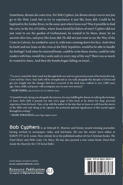Sometimes, dreams do come true. For Bob Cyphers, his dream always was to not just go to the Holy Land, but to try to experience it just like Jesus did. Could he be baptized in the Jordan River, in the same spot where Jesus was? Was it possible to find the cove, in the Sea of Galilee, where Jesus found his fishers of men? Cyphers did not just want to see the garden of Gethsemane; he wanted to be there, alone, by an ancient olive tree, and pray like Jesus did. He did not just want to see the Way of the Cross to Calvary; he needed to carry it, with tears running down his face. And when he knelt and saw Jesus on the cross at the Holy Sepulcher, would he be able to handle his feelings? And when he returned home, could he write those stories, could he take readers with him, would they smile and cry every step of the way? There was so much he wanted to share. And then the bombs began falling on Israel . . .