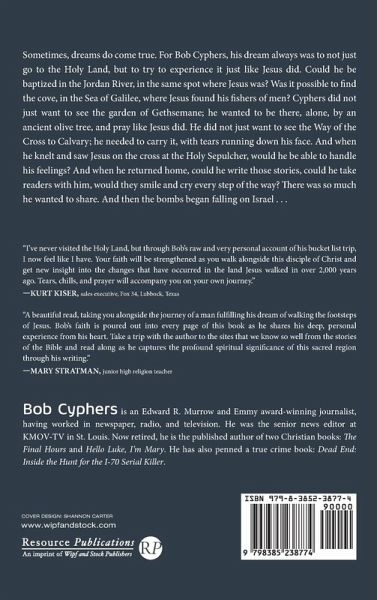 Sometimes, dreams do come true. For Bob Cyphers, his dream always was to not just go to the Holy Land, but to try to experience it just like Jesus did. Could he be baptized in the Jordan River, in the same spot where Jesus was? Was it possible to find the cove, in the Sea of Galilee, where Jesus found his fishers of men? Cyphers did not just want to see the garden of Gethsemane; he wanted to be there, alone, by an ancient olive tree, and pray like Jesus did. He did not just want to see the Way of the Cross to Calvary; he needed to carry it, with tears running down his face. And when he knelt and saw Jesus on the cross at the Holy Sepulcher, would he be able to handle his feelings? And when he returned home, could he write those stories, could he take readers with him, would they smile and cry every step of the way? There was so much he wanted to share. And then the bombs began falling on Israel . . .
