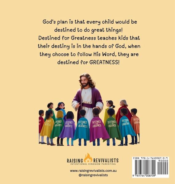 Destined for Greatness - God's Plan For Every Child is a simple message for children teaching them God's plan, that every child would be destined to do great things! Destined for Greatness teaches kids that their destiny is in the hands of God, when they choose to follow His Word, they are destined for GREATNESS. This book is based on the lyrics from the song "Destined for Greatness" by Children of Destiny and includes scripture references that align with the truths being taught. Full of bright simple illustrations, this message aims to help kids to see how they can do great things for God, helping others and following His Word. A great gift idea. Bonus Spotify link inside to a song with lyrics that match the story of this book.