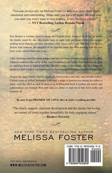 Discover the magic of New York Times bestseller Melissa Foster's writing, and see why millions of readers have fallen in love with the Bradens. Love hot cowboys? In DESTINED FOR LOVE... Rex Braden is wealthy, hard working, and fiercely loyal. Sweat at his brow, he works the family ranch by day, then kicks back at night with part time lovers who require nothing more than his physical presence a few times each week. But that was before. Before Jade Johnson, the daughter of the man his father has been feuding with for over forty years, moves back into town. After ditching a horrific relationship--and her veterinary practice in the process--Jade Johnson returns to the safety of her small hometown and finally finds her footing. That is...until her horse is injured and Rex Braden comes to her rescue. The last thing she needs is a bull-headed, too-handsome-for-his-own-good Braden complicating her life. Despite the angry family history, sparks fly between Rex and Jade, and attitudes follow. Fifteen years of stifled, forbidden love stirs a surge of passion too strong for either to deny--and the rebel in each of them rears its powerful head. Loyalties are tested, and relationships are strained. Rex and Jade are about to find out if true love really can conquer all. DESTINED FOR LOVE is the fifth book in the Love in Bloom series (The Snow Sisters, The Braden, & The Remingtons), and the 2nd book in The Bradens. While Destined for Love can be read as a stand-alone novel, for even more reading enjoyment you may want to read the LOVE IN BLOOM series in series order. Be sure to get PROMISE MY LOVE, Rex & Jade's wedding novella! DESTINED TO LOVE is a BRONZE MEDAL WINNER in the Readers' Favorite Awards - Romance Sizzle Category All BRADEN novels can be read as stand-alone books or as part of the larger series. THE BRADENS (Weston, CO) Lovers at Heart (Treat & Max) Destined for Love (Rex & Jade) Friendship on Fire (Josh & Riley) Sea of Love (Dane & Lacy) Bursting with Love (Savannah & Jack) Hearts at Play (Hugh & Bree)